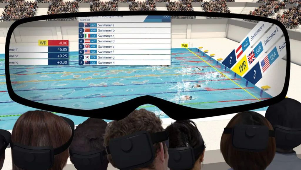 所以人们的聚焦点必须在泳池和显示器之间来回切换。在游泳比赛中将向观众分发支持5G网络的AR装备,戴上后可在关注运动员动作的同时,看到谁在哪个泳道、单圈时间以及是否接近世界纪录等数据。