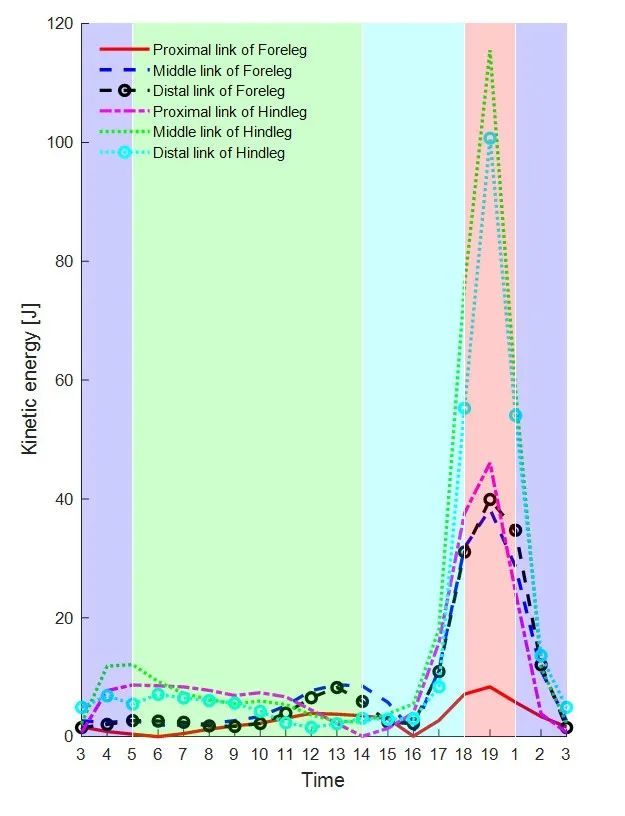 生物学家Hildebrand在其以往的研究中将猎豹的单个运动周期均分为19份,本文在他的研究基础上,提取了猎豹的前肢和后肢在对应时刻各关节角的运动数据,并参照真实猎豹的躯体尺寸,重建了单周期内前后腿各段在各个时刻的位置,如图 3所示。