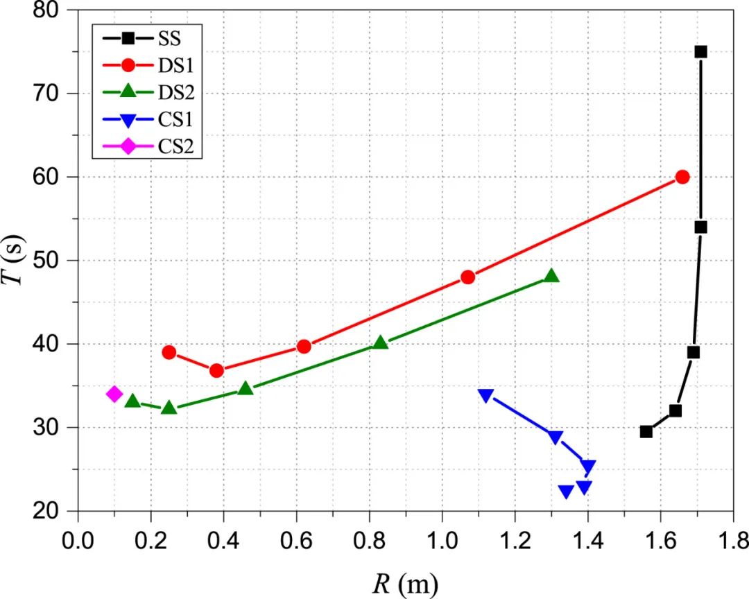图12是航行器机动性测试结果。其中黑色数据点(SS)代表螺旋桨推进、使用胸鳍作为尾舵进行转向机动,红色数据点(DS1)和绿色数据点(DS2)代表单独使用胸鳍的不对称运动进行转向机动。由图可见,两种仿生转向方式相比于螺旋桨推进尾舵机动都能够达到更小的转弯半径;而在仿生转向时,由于推进速度并不高,所以与将右侧两个胸鳍竖立倾斜作为尾舵的方式相比,将其平行放置能有助于减小转向阻力( DS2的转向半径和回转周期都优于 DS1)。蓝色数据点(CS1)代表螺旋桨推进转向时,使用 DS1 仿生转向提高转向性能,相比于螺旋桨推进、尾舵转向,该组合转向方式能够实现更小的转弯半径和回转周期。粉色数据点(CS2)代表在 DS2 仿生转向时,让螺旋桨反转,减小航行器前进方向的速度,转弯半径相比 DS2 方式进一步减小,几乎实现了原地转向。