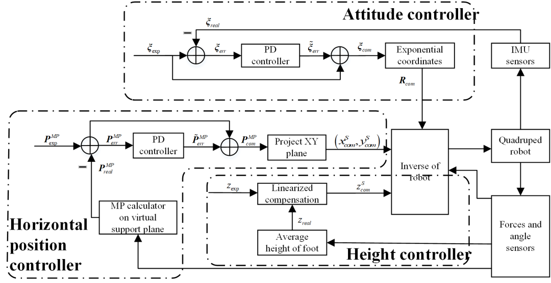 本文提出了自适应步态的整体运动规划(图4)和机身整体的控制方法(图6)。机器人根据当前的机身位姿和立足点,选择摆动腿,利用其它支撑腿计算虚拟平面用于机器人的稳定裕度计算,调整机身稳定裕度,移动机身到达最大稳定位置,摆动腿搜索可行的立足点(在此过程中,机器人实时计算惯性中心,并调整惯性中心保证稳定)。机器人的机身控制系统主要分为姿态控制器、高度控制器和水平位置控制器:姿态控制器在姿态指数映射空间下进行描述和控制;高度控制器根据机器人立足点的高度进行线性规划;机身水平位置控制器根据实时计算的惯性中心进行稳定调整。